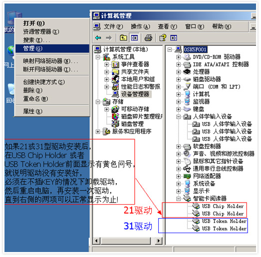 1.进入“我的电脑”(Vista/Win7/Win8系统请右键单击“计算机”)→“管理”→“设备管理器”:如果您在“设备管理器”下看不到“智能卡阅读器”,说明您的电脑还未安装21或31型优KEY的驱动程序,请您下载并安装驱动程序后再尝试。