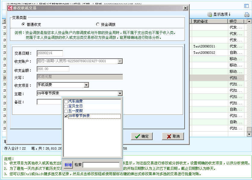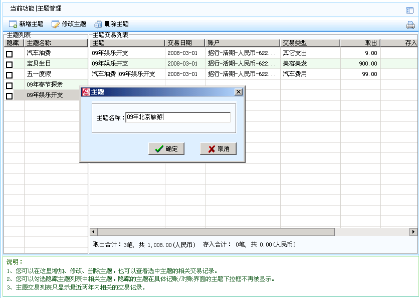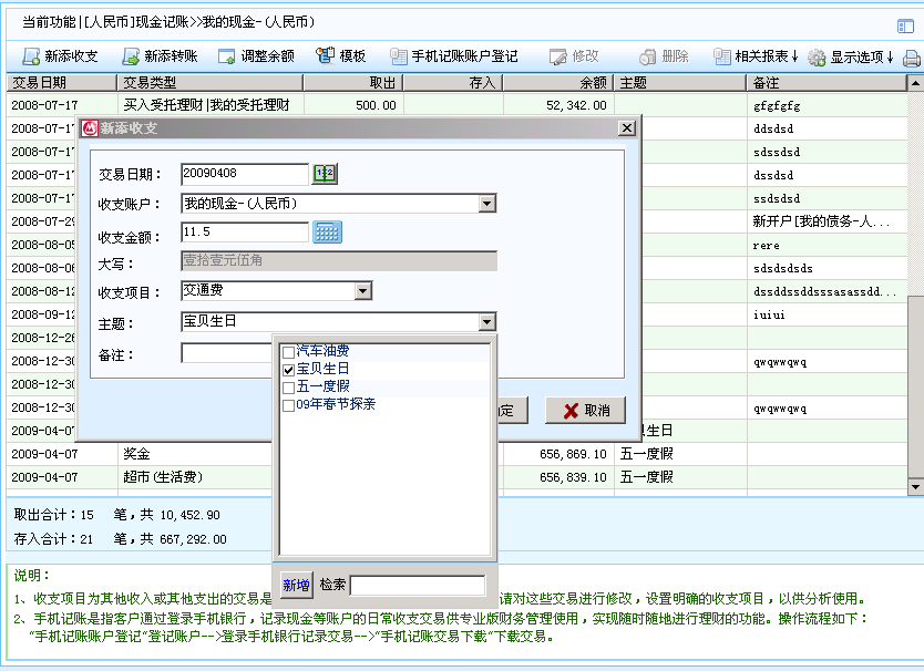 3)在记账/对账界面的“主题”下拉框中选择某种主题,第一次使用时可以点“新增”按钮弹出主题管理界面,先增加后选择主题。