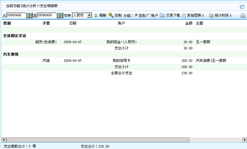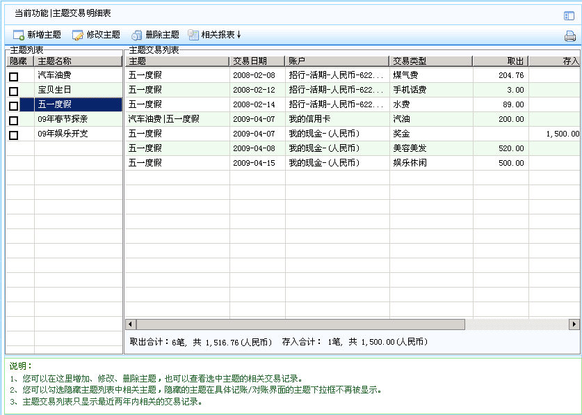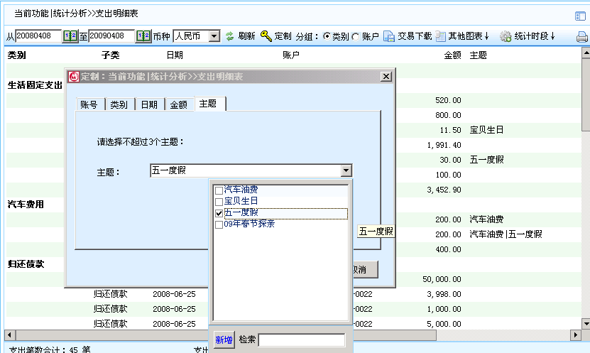 4)记账后可通过“统计分析”/“其他图表”/“主题交易明细表”查看或打印某个或多个主题相关的收支交易,也可通过收支类报表的定制功能显示某个或