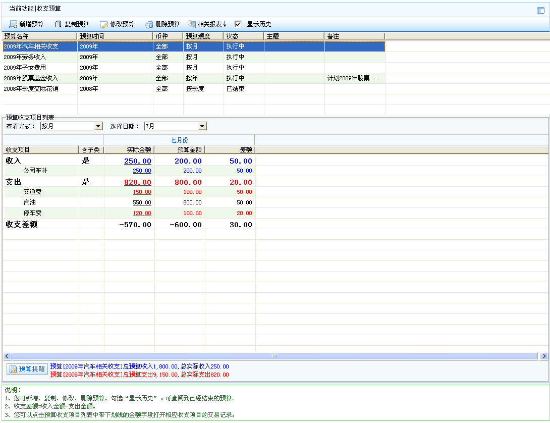 | 2、您可以击菜单对已有的收支预算项目进行修改删除,或者选择一个收支项目作为模板复制修改后建立新的收支预算。 |