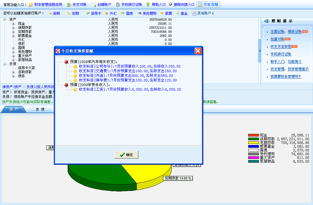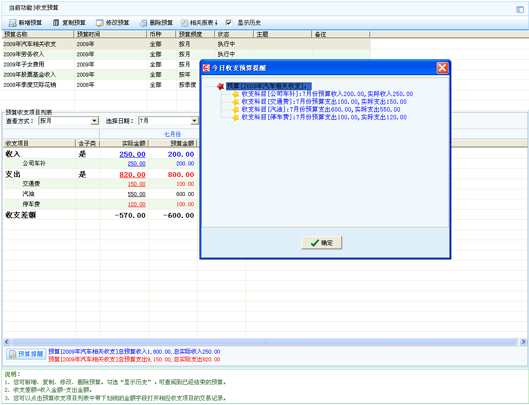 2)如果收支预算设置了预算提醒,那么当实际情况达到预算提醒条件时会显示具体的预算提醒,点击预算提醒图标可以具体查看。 |