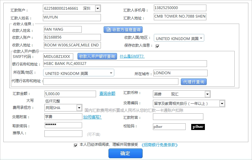 上图是招行跨境汇出汇款示例。